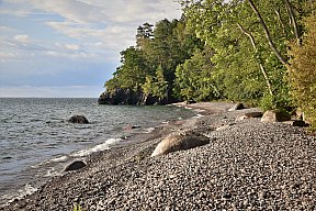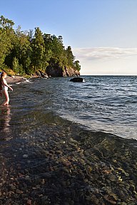 Einige Kilometer nördlich hatten wir auf der Satellitenkarte einer berühmten Kartenapp einen Stellplatz direkt am See erspäht und richteten uns dort für die Nacht ein. Man sollte nicht unerwähnt lassen, dass das Wetter an diesem Tag seine Späße mit uns zu treiben schien: kaum hatten wir den Rastplatztisch gedeckt, goss es wieder. Wir verlagerten das Abendbrot in den Wohnwagen und sahen während des Essens die Sonne hervorkommen. Auf der Karte war ein kleiner Strand nur wenige Schritte einen verwachsenen Weg hinunter zum Seeufer erkennbar gewesen und ich hatte das dringende Bedürfnis nach Bewegung. Als Anni im Bett war, machte ich mich auf die Suche nach besagtem Strand und kaum aus dem Staunen und dümmlich Grinsen nicht heraus. So ein traumhafter Ort! Der Steinstrand lag in einer einsamen Bucht umrahmt von hohen Felsen. Die großen runden Steine wurden von tosenden Wellen aus glasklarem Wasser überspült, während die Sonne tief am plötzlich strahlend blauem Himmel stand. Einige Minuten später kam Linnea dazu und auch sie war fasziniert von dem Fleckchen. Gemeinsam testeten wir die Wassertemperatur, um dann mit komplett nassen Klamotten den Rückweg anzutreten. Jan wurde genötigt, sich selbst ein Bild vom Strand zu verschaffen und Lina schnappte sich überglücklich den Badeanzug…