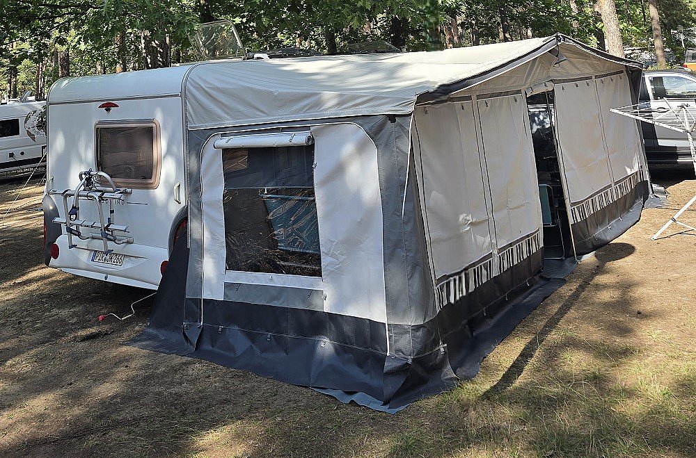 Mit dem Kauf des Wohnwagens haben wir gleich die Chance genutzt, dass Vorzelt "California" (Holiday - Heinz & Linse) (Link zu https://holiday-heinz-linse.de/) mit zu erwerben. Uns hat die Vergangenheit gezeigt, dass wir diesen zusätzlichen "überdachten" Platz (über die gesamte Länge) für die regnerischen Tage und die Auslagerung unserer Ausstattung benötigen. Darin bauen wir den Esstisch samt Stühle sowie ein Außen-Sidebord auf.